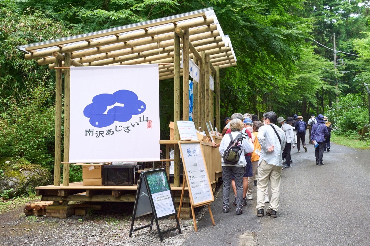 Together, he and Minamishima have worked to sustain and expand Minamisawa’s vision, adopting construction methods and management practices that respect the forest ecosystem. They have constructed a reception counter for collecting entry fees, and added several viewing terraces where visitors can get an elevated look at the hydrangea fields. The entry fees go toward operation and maintenance costs , a sustainable management policy. The structures were built of eco-friendly, locally sourced materials, such as cedar and cypress from the Tama area, using traditional Japanese carpentry methods. Wood was the material of choice in order to minimize the use of concrete. “Unlike concrete, wood maintains harmony with the natural environment and creates spaces where insects and plants coexist, ” says Takamizu. “We try to make use of what the forest provides us.” The water system uses water drawn directly from the mountain, and felled wood is used for retainer walls for erosion control and as benches.