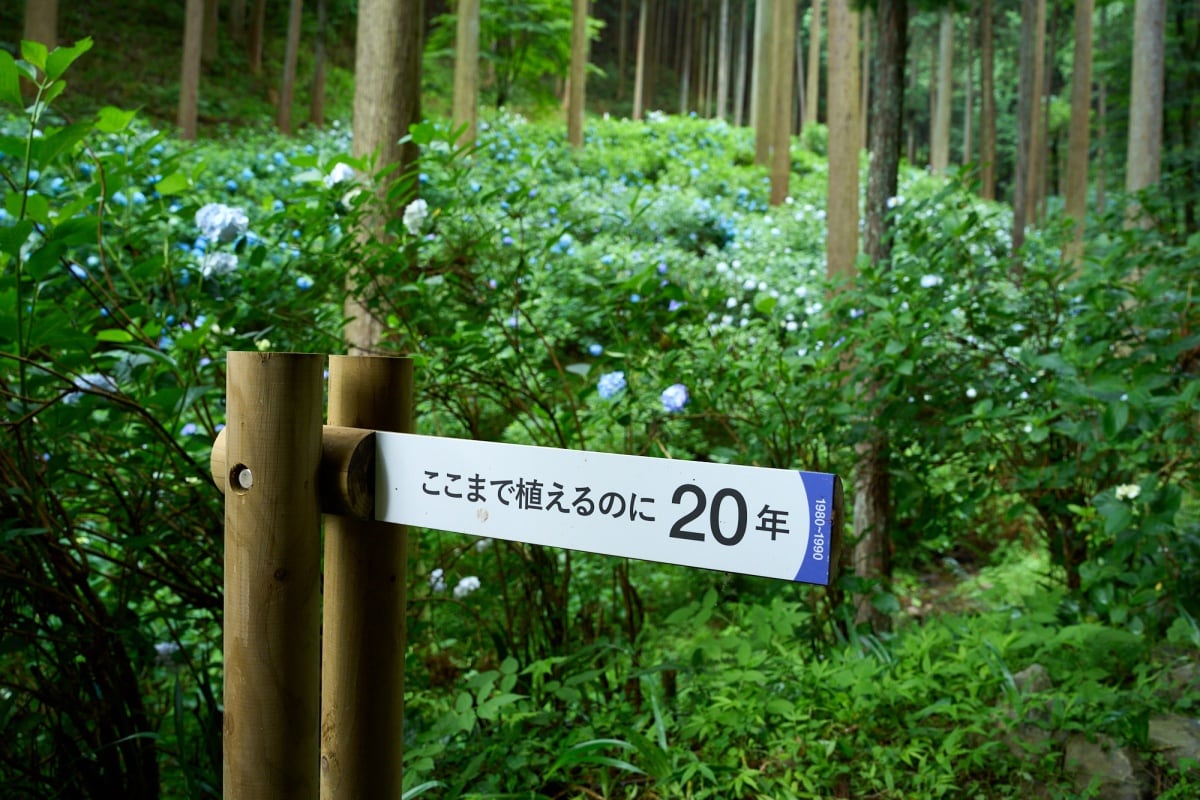 A sign on the path relates the story of Chuichi Minamisawa, the man who created Minamisawa Hydrangea Mountain.