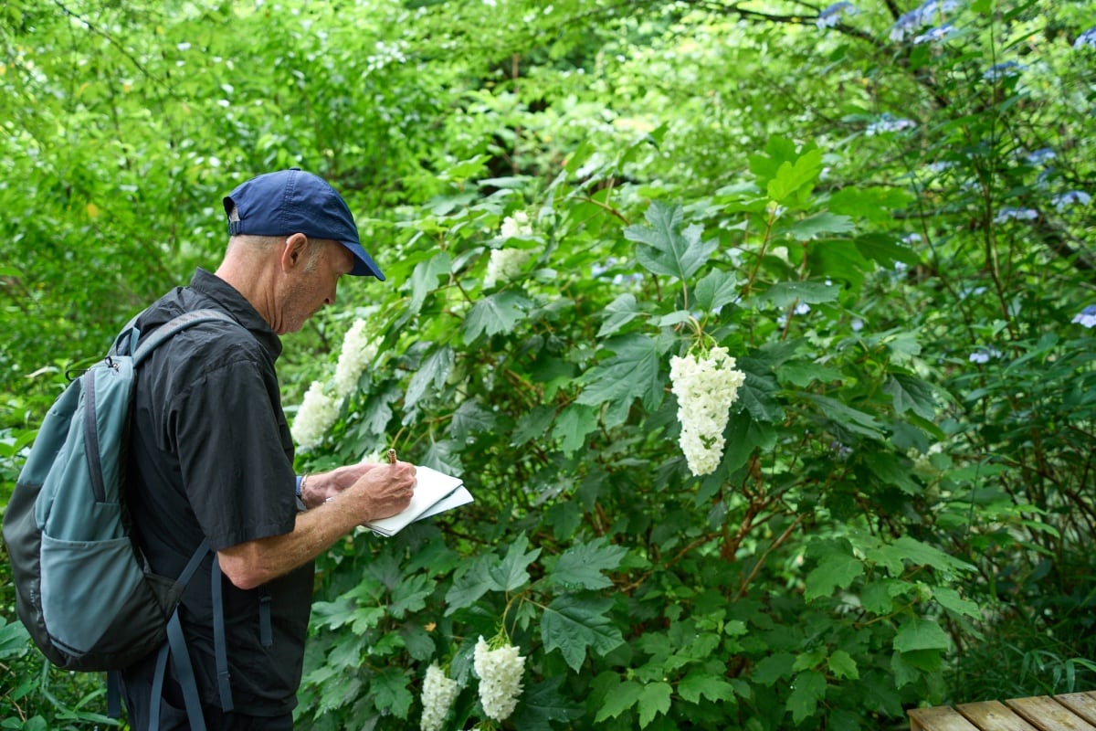 On our walk through the valley, he points out areas slated for new plantings, sometimes undertaken with the help of volunteers. Back at the foot of the circuitous trail, he leads us through the nursery area where young hydrangeas are growing. “It usually takes three years before they are strong enough to plant in the forest,” Minamishima says. “They have to be able to compete with the fast growing undergrowth.”