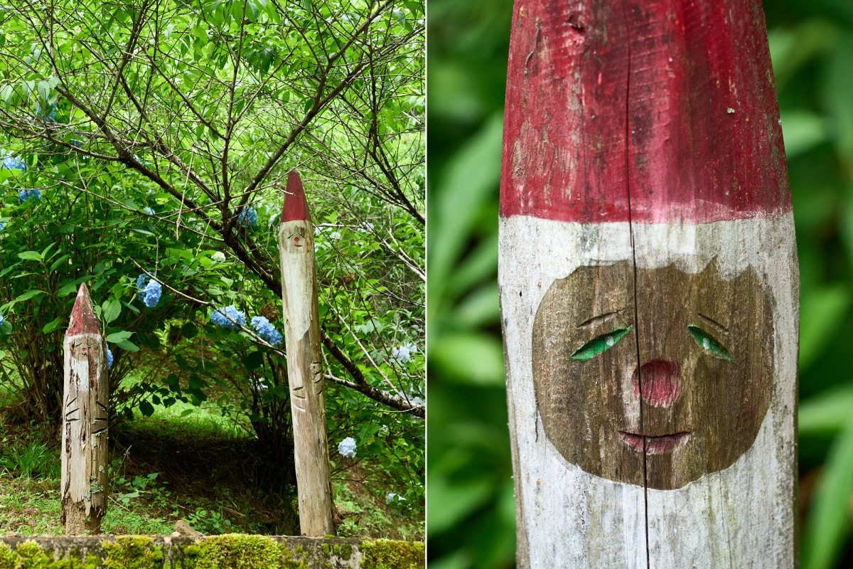 A well-known sculptor made these wooden guide dolls, called “Fairy Jiji,” for Minamisawa Hydrangea Mountain.