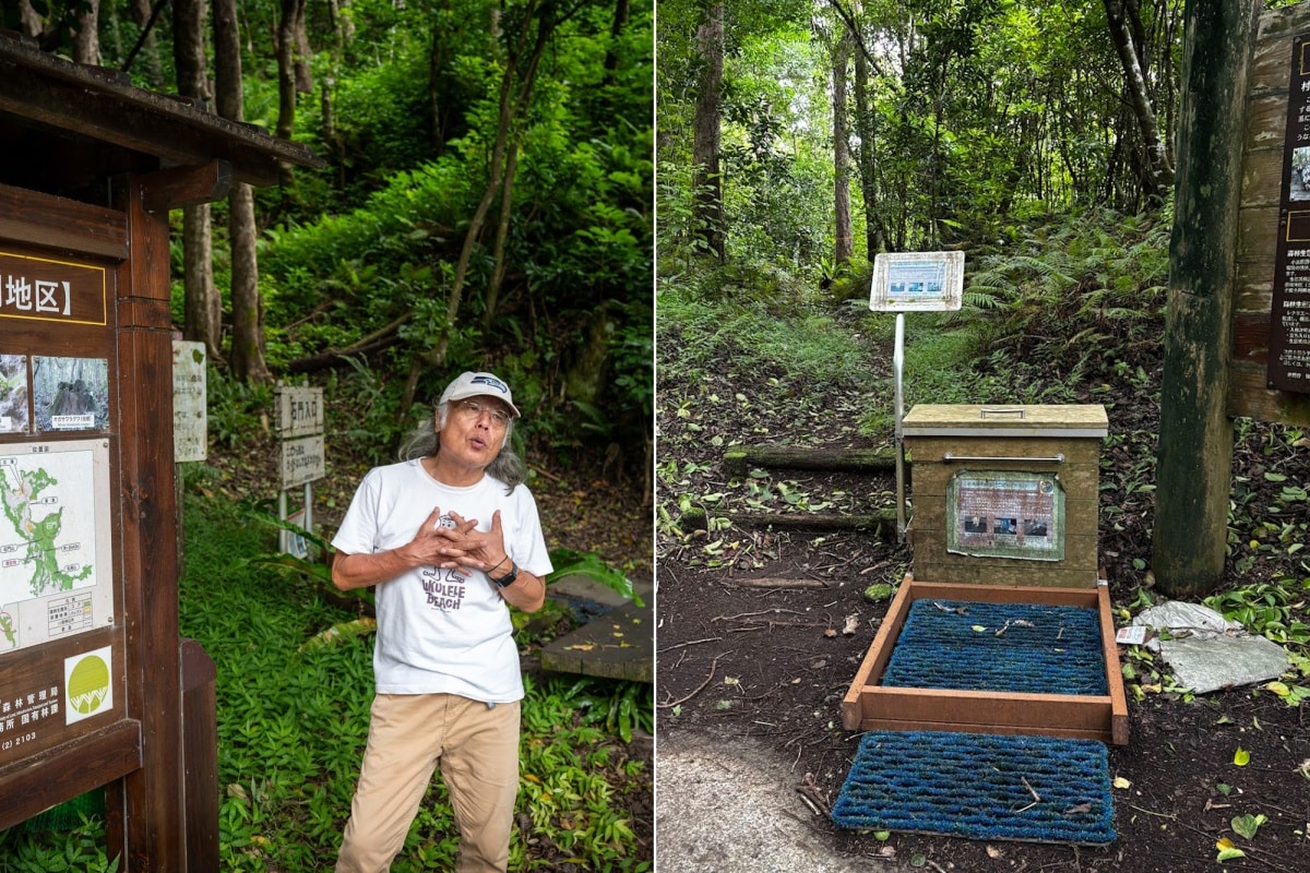 During these hikes the pair takes special care to prevent the spread of invasive species that could threaten the island’s natural treasures. “If we’re moving between mountains, we collect plant seeds that might be on our clothes when we move, or animal eggs,” explains Konishi. The island’s red soil also creates problems because it sticks to shoes. “We’re careful to use mud-removing mats,” he adds. “And make sure that our customers are careful too.” Tokyo Metropolitan Government rangers also ask visitors to clean their shoe soles when boarding boats traveling between the islands to prevent contamination.