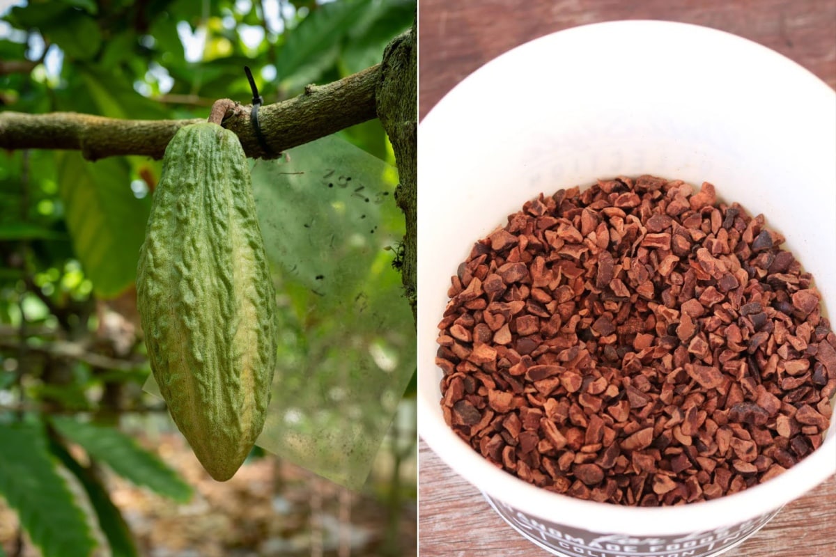 (Right) Fermented and roasted cacao beans, crushed into cacao nibs — the starting point of chocolate.