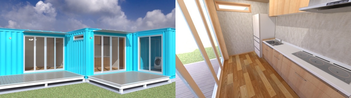 Front of the container adapted to house the kitchen and workshop.