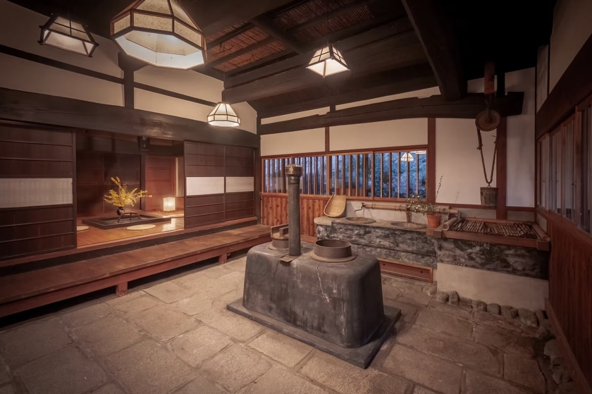 The doma is an indoor workspace. Though they commonly had floors of packed earth, this example in Miyama north of Kyoto is paved in weathered stone. The wood-fired cookstove is still functional. (photo: Miyama Futon and Breakfast)