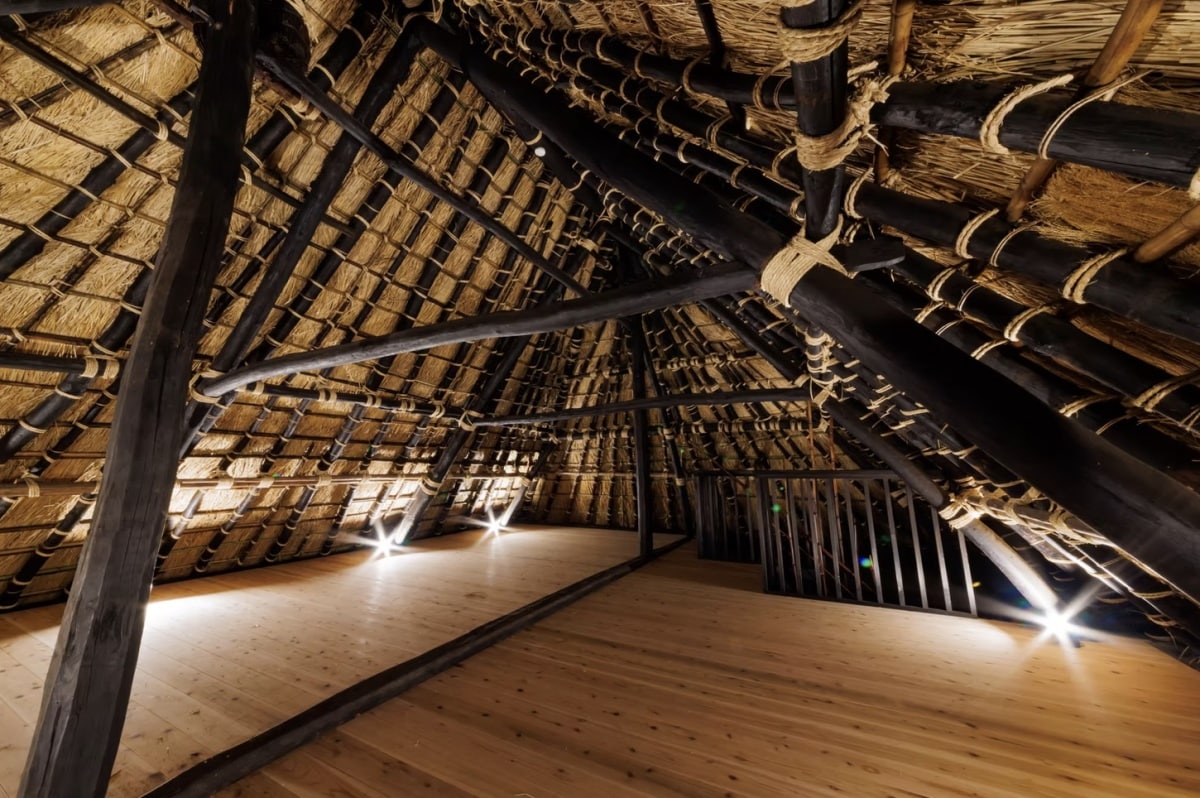 Many minka have upper attic spaces originally used for storage or raising silkworms, typically made of wooden poles and bamboo lashed together. This building technique is largely unchanged since prehistoric times. (photo: Miyama Futon and Breakfast)