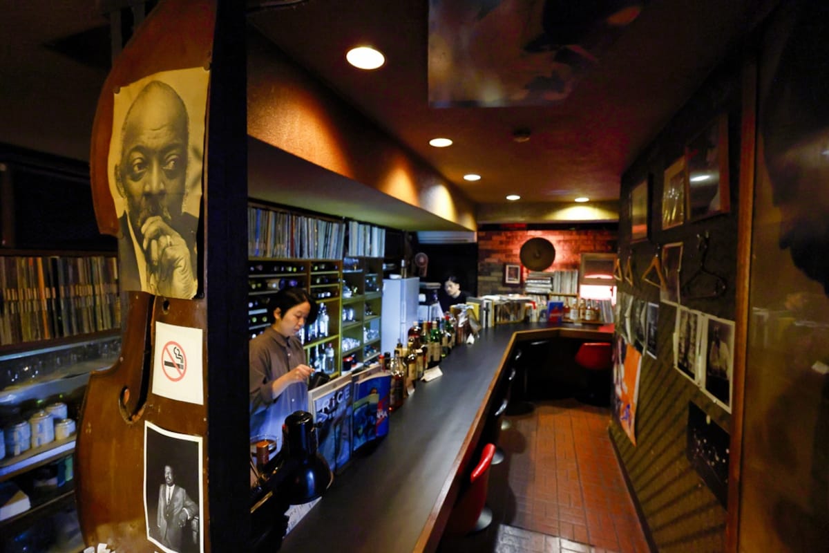 The sign at the bottom of a steep flight of stairs reads "Jazz, Coffee, Whisky." This has been the order of business here since it was founded in 1956, just four years after the end of the US postwar occupation and still in the early days of Japan’s infatuation with jazz.