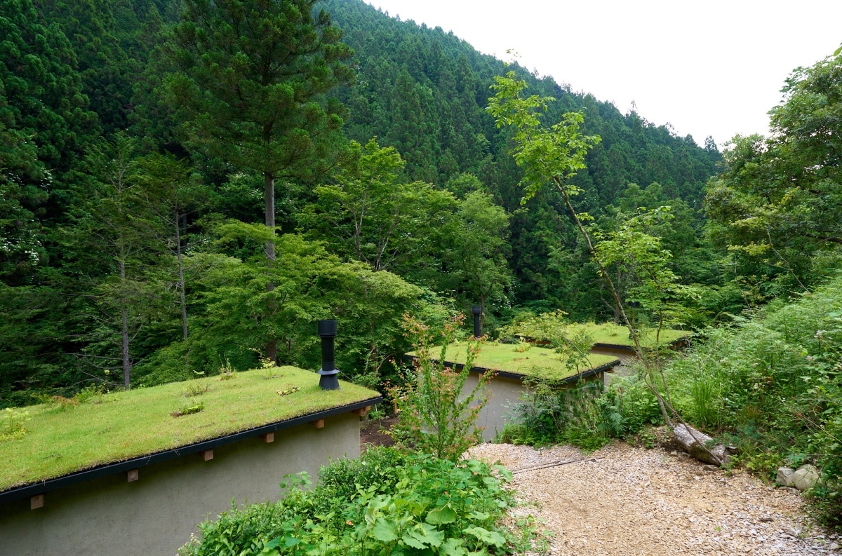 草屋根の一部はあえて芝生を剥ぎ、檜原村に自生する植物を植栽。周辺環境との調和を図っている。
