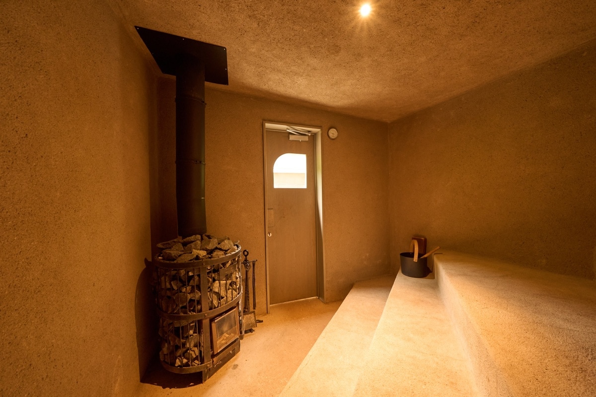 中でも会員から人気が高いのが薪ストーブ式サウナだ。室内のデザインはサイトによって違い、KITONEサイトは木の根をモチーフにしたデザイン。ベンチには施設を作るときに伐採した丸太を六角形に組み合わせ、視覚的にも楽しい空間に仕上がっている。一方、IWASUNAサイトは檜原村の土を混ぜた左官仕上げで、岩に囲まれたようなモダンな空間だ。それぞれのサイトで異なる趣を持ち、訪れるたびに新鮮な体験ができるのも魅力のひとつだ。