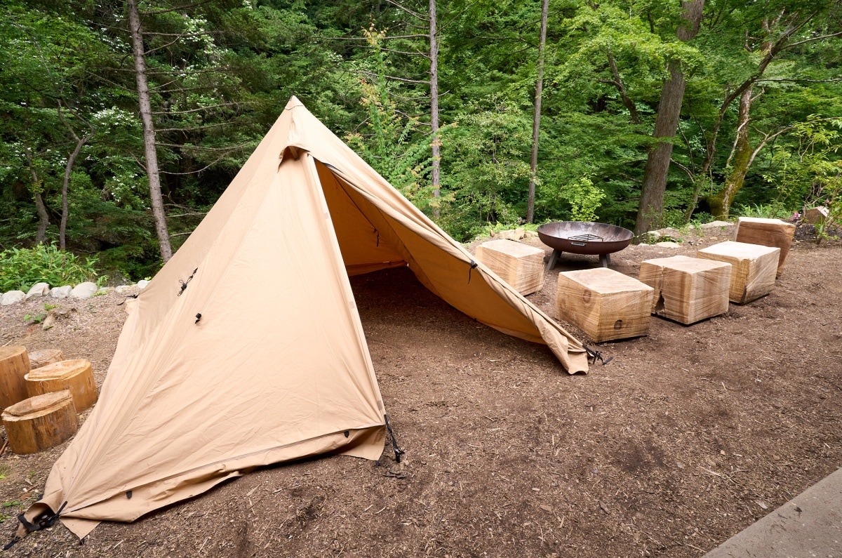 各サイトのオープンスペースにはテントを張れるスペースもあり、持ち込みでの設営も可能。