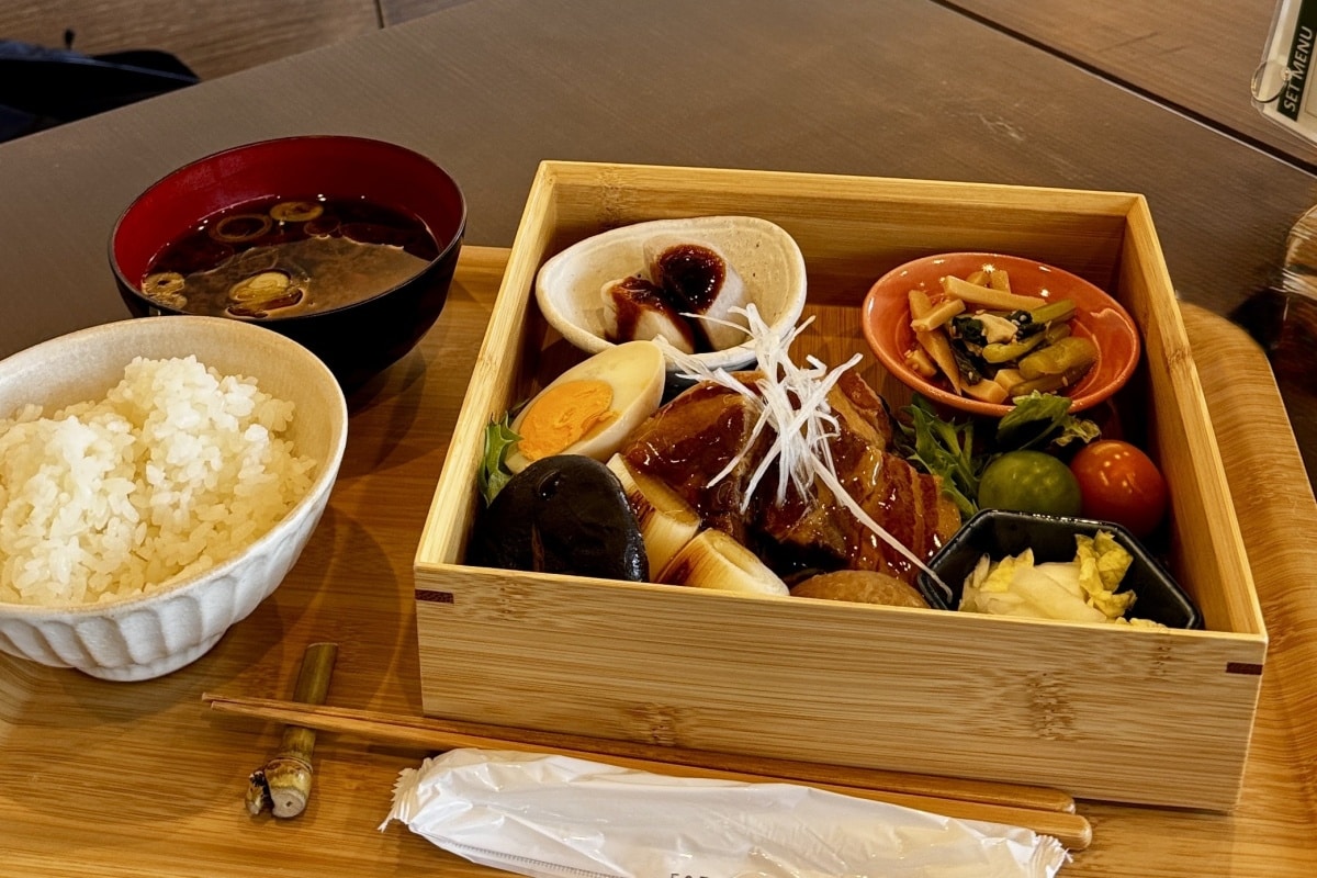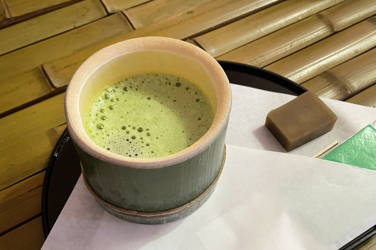 ระหว่างเดินเล่นชิลๆ ชมวิวเขียวของต้นไผ่และถ่ายรูปมุมสวยก็แวะจิบชาเขียวมัทฉะที่เป็นเมนูพิเศษเสิร์ฟในวันเสาร์อาทิตย์และวันหยุดนักขัตฤกษ์ ก่อนที่จะทานมื้อกลางวันที่ร้านคาเฟ่ของฟาร์มที่มีเมนูโดยใช้วัตถุดิบตามฤดูกาล ให้ความรู้สึกผ่อนคลายและได้ชาร์จพลังอีกครั้ง