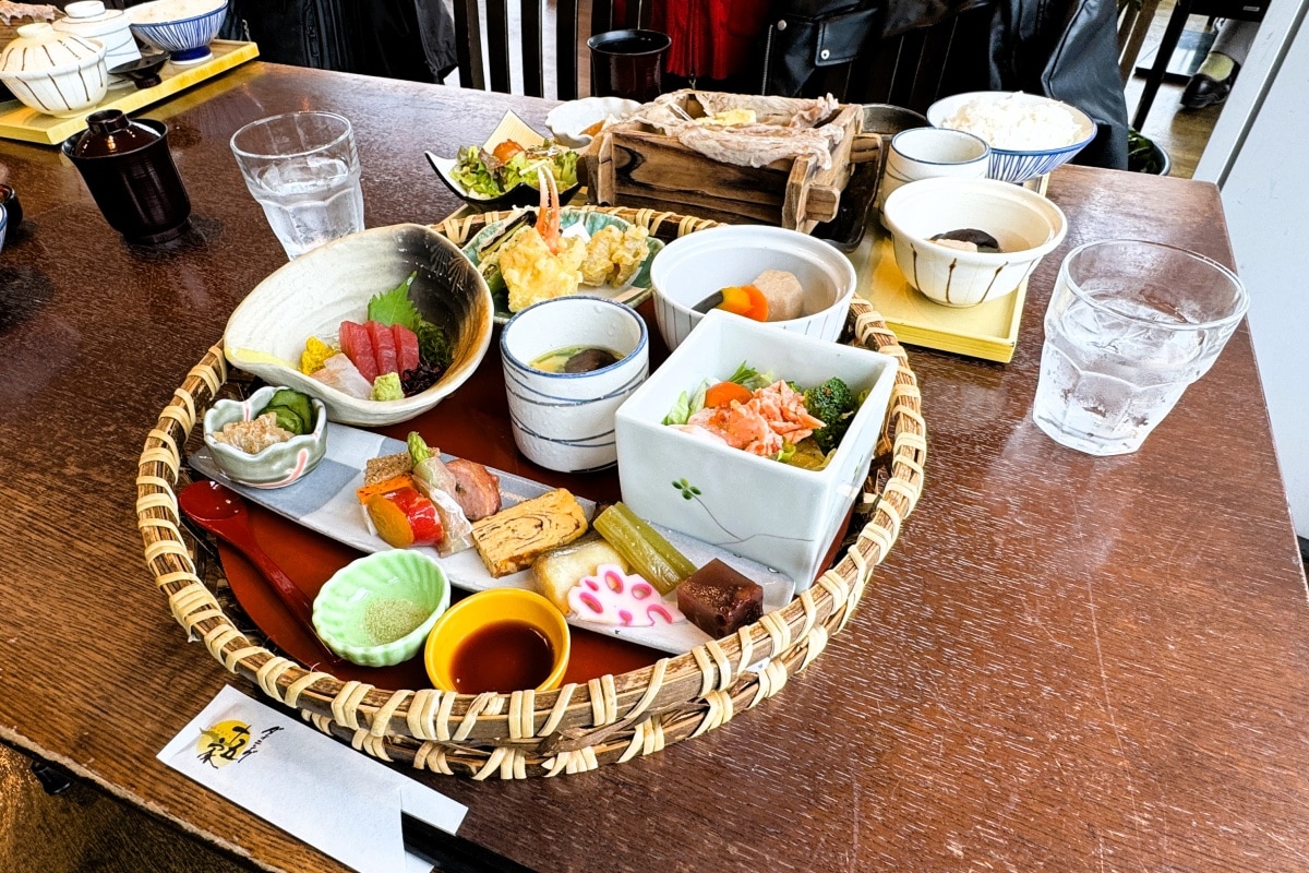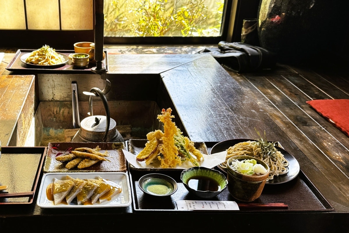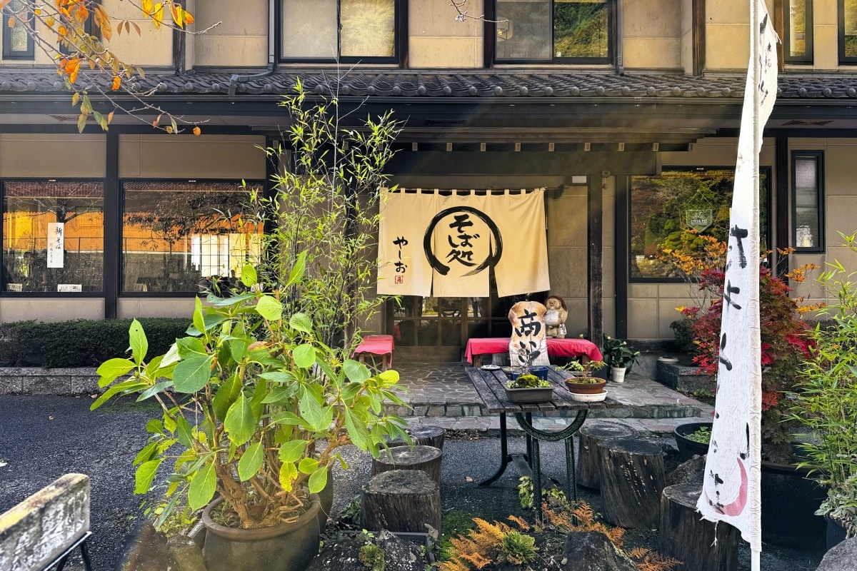 午餐時間,來到步行約 5 分鐘的「そば処 やしお」,這間板室溫泉附近的人氣蕎麥麵店,使用地粉手打的蕎麥麵香氣高雅、口感滑順。招牌「やしお蕎麥麵」與當地野菜天婦羅評價極高,窗外展開的里山風景,讓午餐時光更顯療癒。「山椒味噌蒟蒻(山椒味噌こんにゃく)」與「香酥炸稚香魚(稚鮎の唐揚げ)」等小食也是必點的人氣名物。