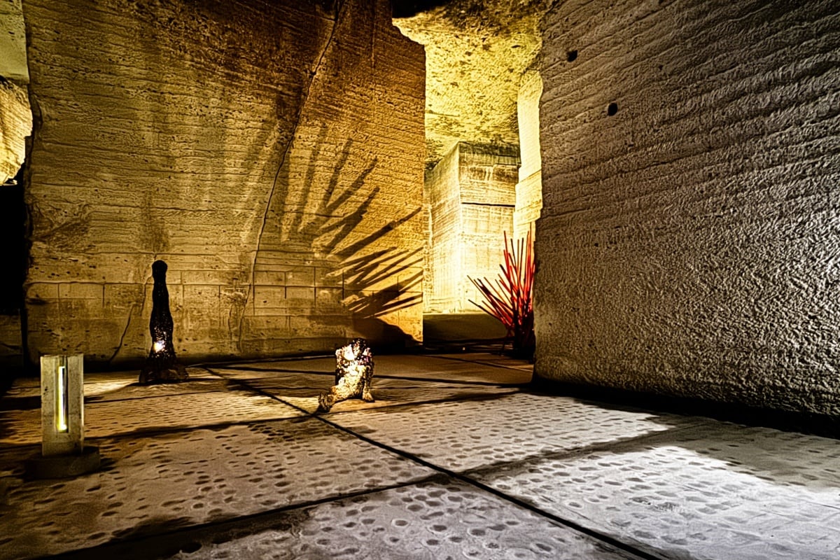 「大谷資料館」是大谷石採掘場遺跡。這座全長兩萬平方公尺的巨大地下空間,平均深度達 30 公尺,是日本國內極為罕見的奇觀。走入其中,高達數十公尺的石壁層層相連,在精心設計的燈光照射下,呈現出如地下神殿般的夢幻與莊嚴氛圍。這處被藝術家與電影拍攝團隊譽為「石之聖地」的地方,其浮現的石材質感與獨特的空間感,瞬間將人帶入非日常的奇幻世界。