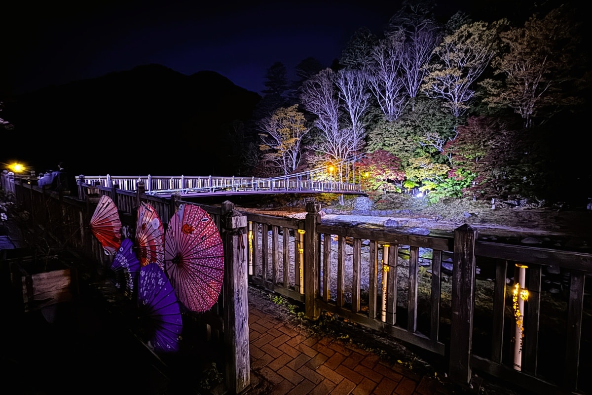 夜幕降臨後,不妨前往那須地區的紅色吊橋(紅の吊橋)欣賞夜晚點燈。吊橋被柔和的紅光照亮,營造出夢幻氛圍。光影映照在水面與紅葉的對比,正是秋日終章的華麗演出。與白日截然不同的寂靜與美麗令人心醉,為旅程畫下完美句點的景觀。