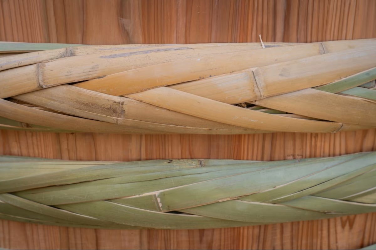 山本康夫正在編製傳統木桶的竹箍(竹たが),這項看似簡單的技藝,卻是維繫整個木桶工藝的關鍵所在。(攝影:Cindy Bissig)