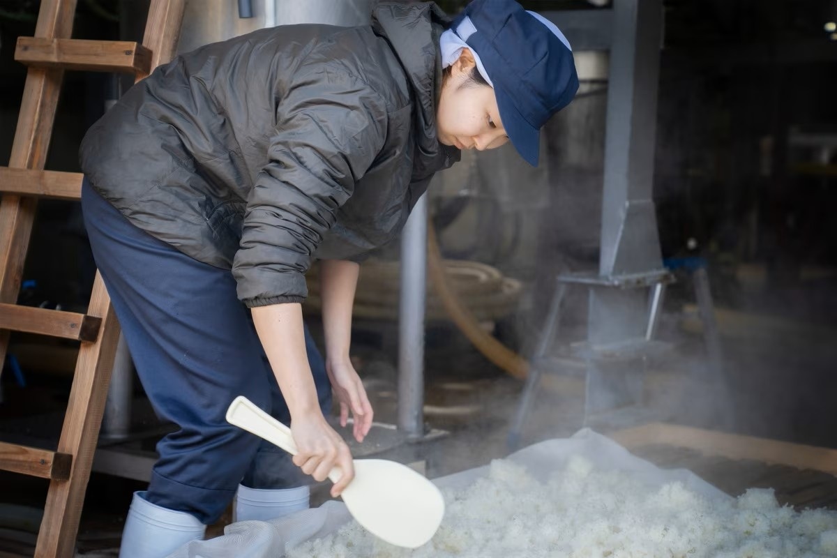 酒廠工作人員將新鮮蒸熟的米飯攤開冷卻,準備進入清酒釀造的下一個階段。(攝影:Cindy Bissig)