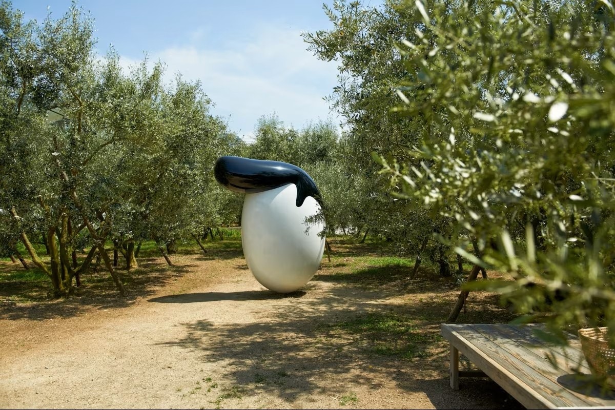 幾件特別值得留意的作品,包含崔正化的《Gift of The Sun(太陽的贈禮)》,是一頂金色橄欖花環,就掛在土庄港入口,迎接每一個踏上島的人;清水久和的《Regent in Olives(橄欖飛機頭)》,一顆橄欖梳著1950年代的飛機頭,底下還兼賣蔬果,無人看守,自行取用投錢。近年加入的,是矢延憲司以「搭船的貓」為概念打造的《SHIP'S CAT》系列雕塑,守護旅途平安的象徵意味,放在這座島上格外合適。